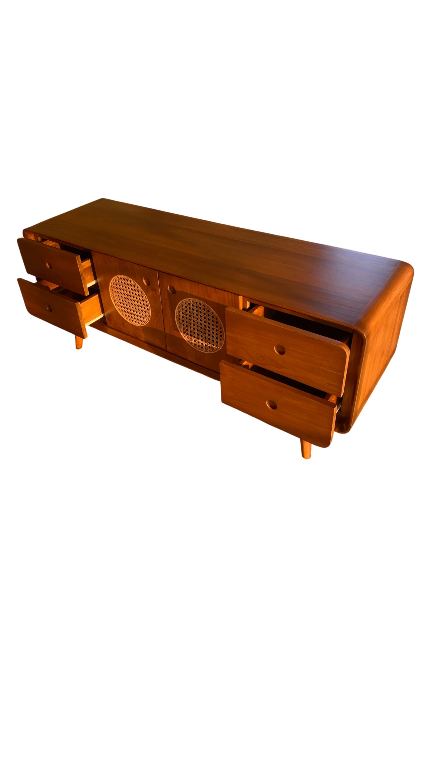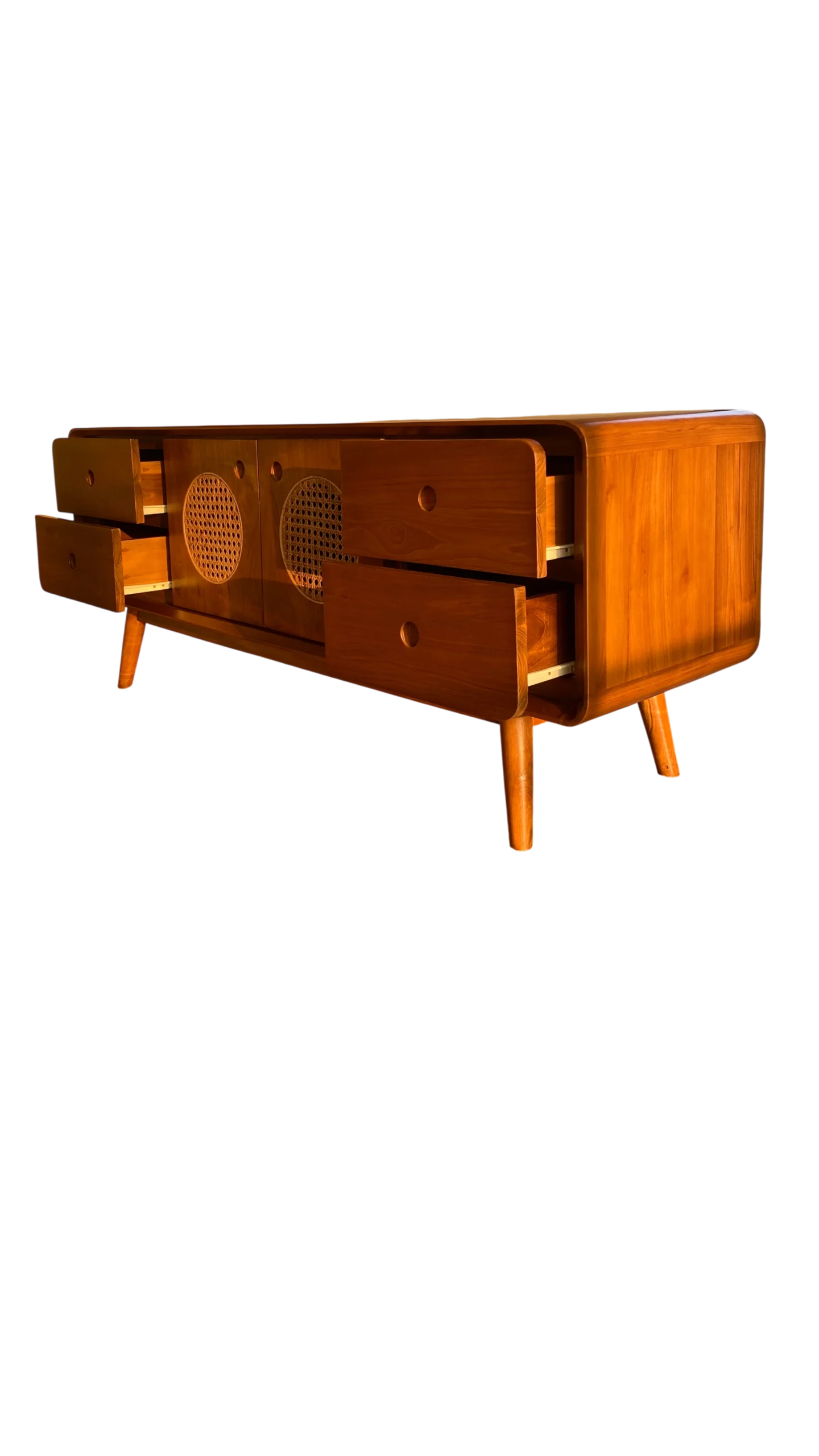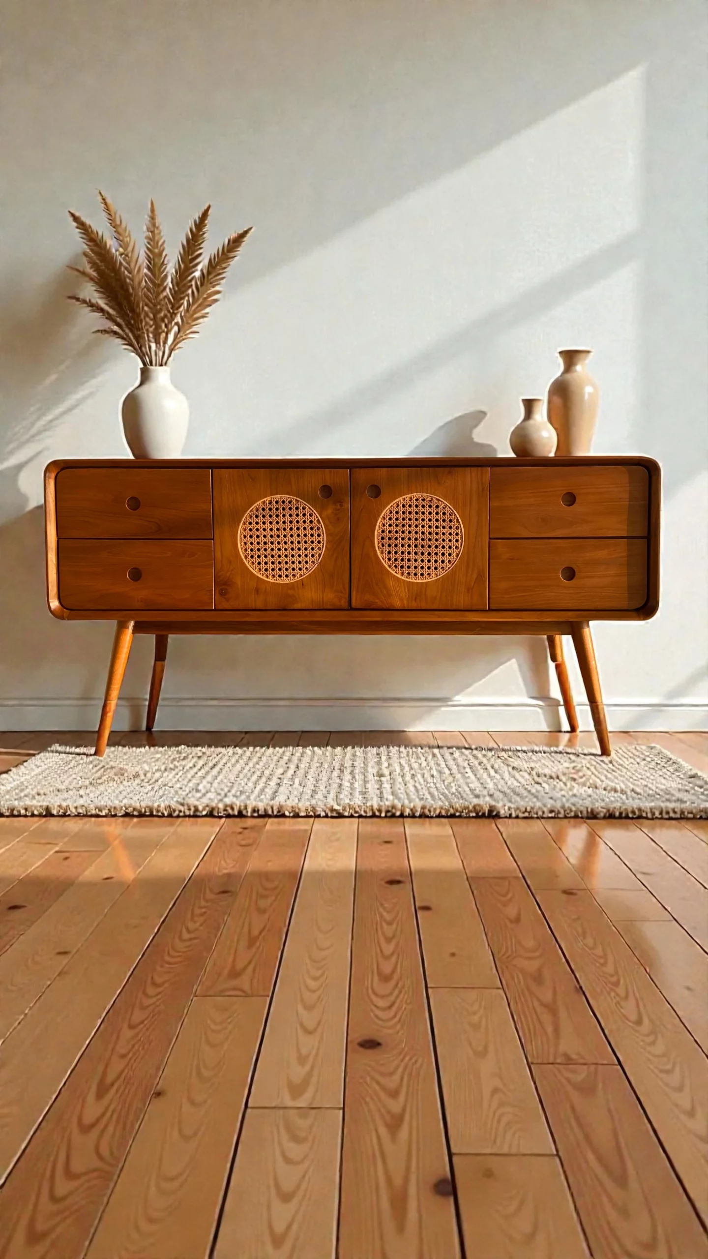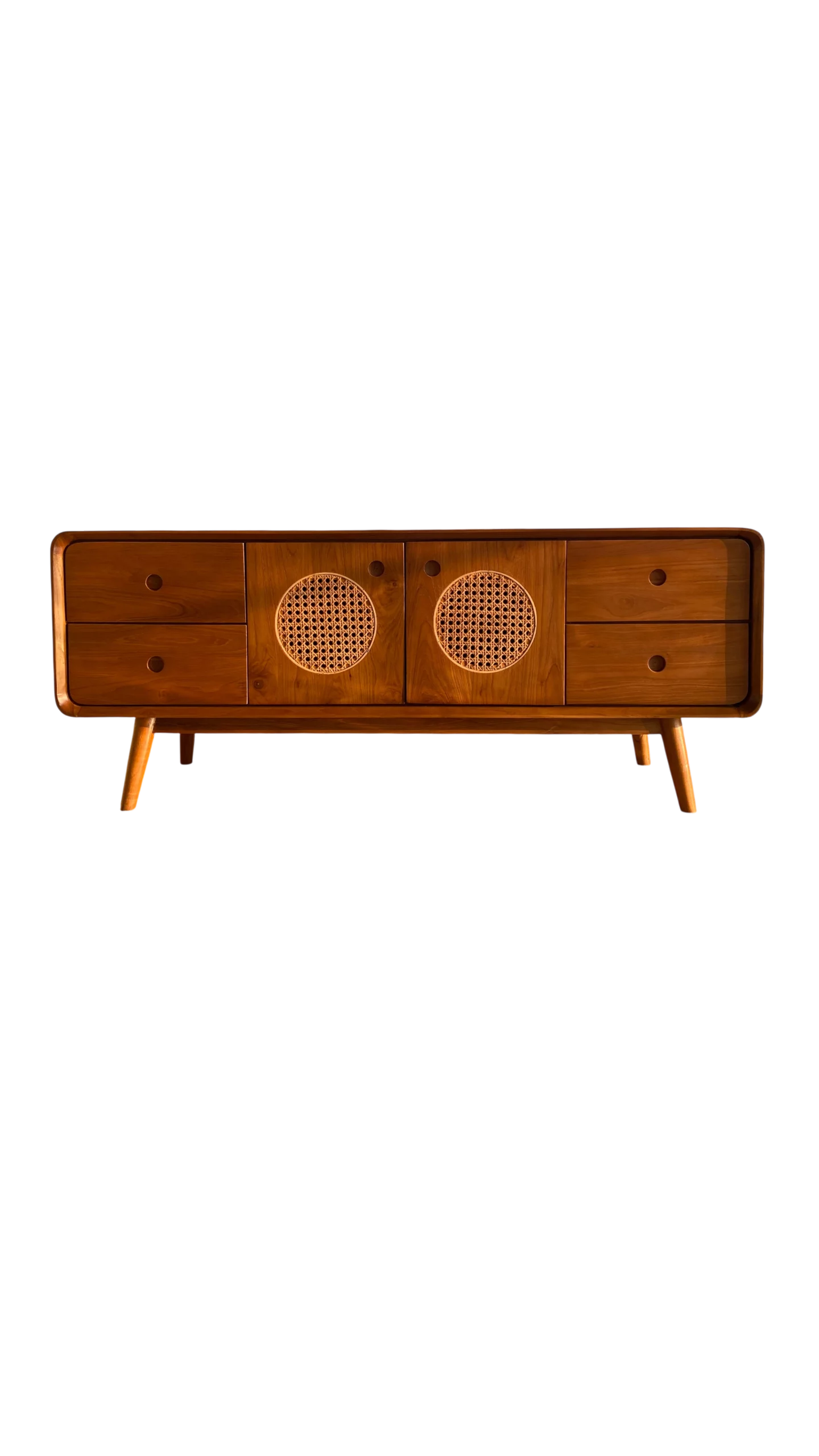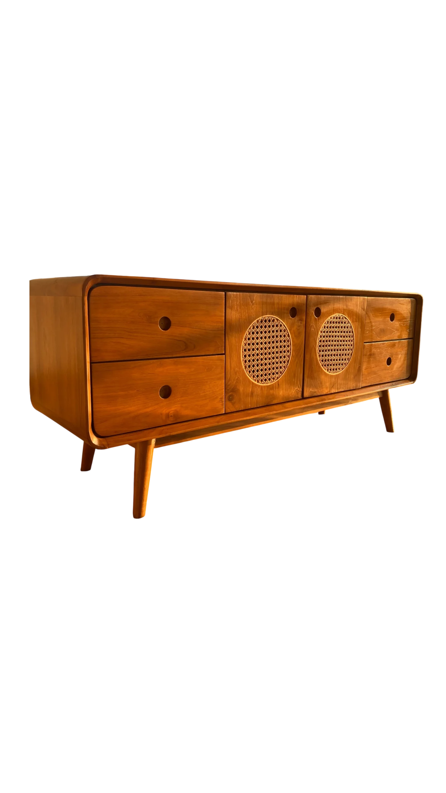 Gaya Jepang-Skandinavia kini hadir dalam bufet hias kayu jati yang simpel namun sophisticated. Warna kayu naturalnya memperkuat atmosfer tenang dan bersih dalam ruang.